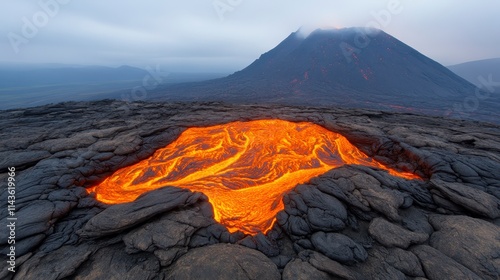 A stunning view of a glowing lava lake surrounded by rugged volcanic rock, with a majestic mountain in the background under a cloudy sky.