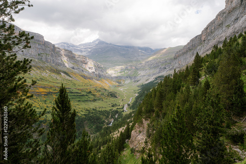 A stunning view of a green valley surrounded by towering mountains in Ordesa y Monte Perdido National Park, Spain. A perfect destination for trekking, hiking, mountaineering, and summer outdoor