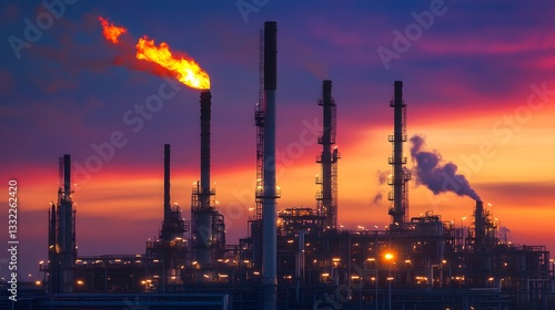 A stunning view of an industrial facility at sunset, showcasing smokestacks and flames against a colorful sky. This image captures the contrast between nature and industry.