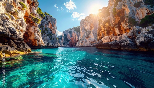 sea, water, cliff, rock, coast, nature, landscape, ocean, blue, sky, sun, sunbeam, light, travel, scenic, bay, cove, mediterranean, summer, vacation, island, geology, erosion, formation, seascape, beauty, serene, peaceful, clear, transparent, aquamarine, natural, daylight, horizon, coastline, geography, tour tourism
