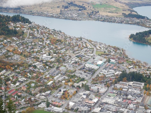 A stunning view of the lakeside city from a high vantage point, creating a picturesque and peaceful scene.