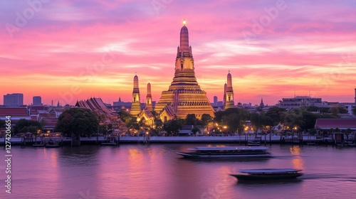 A stunning view of Wat Arun, illuminated at sunset, reflecting in the Chao Phraya River with vibrant pink and purple skies.