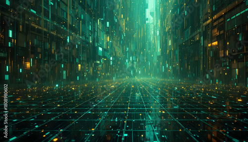 A stunning visualization of a digital cityscape with glowing green and yellow lights, resembling a futuristic metropolis teeming with data streams and interconnected networks