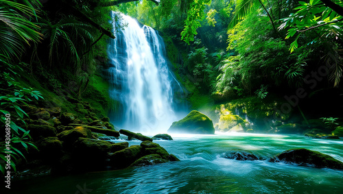 A stunning waterfall cascades over rocks covered in lush green moss in a park.