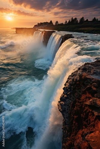 A stunning waterfall plunges into the ocean at sunset