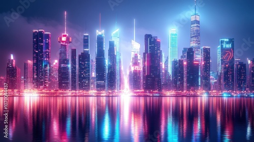 city skyline, night time, waterfront, neon light, city landscape, reflections, background, vibrant, architecture, city lights, modern, photo, city landscape, night photography, bright, metropolis, highrise, night scene, beautiful, serene, twilight, atmospheric, dynamic, scenic view, artistic, widescreen, landscape, wallpaper