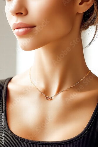 woman, necklace, gold, jewellery, neck, beauty, elegant, fashion, portrait, face, skin, closeup, model, style, accessory, glamour, chic, luxury, closeup, female, pretty, stylish, attractive, person, adult, beautiful, brunette, lip, hair, shoulder, chain, gemstone, wear, design, studio, light, natural, sensual, soft, glow, summer, body, black, top, profile, graceful, minimalist, sophisticated, gem
