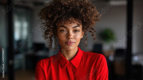 woman, portrait, beautiful, curly, hair, red, shirt, office, confident, business, professional, face, head shot, style, attractive, elegant, eye, female, adult, looking, person, expression, smile, natural, beauty, closeup, fashion, model, studio, serious, african, american, brunette, youth, well-being, success, career, leadership, positive, background, interior, daylight, bright, skin, texture, pose, light, stylish, well
