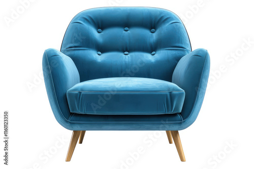 A stylish blue upholstered armchair with wooden legs, designed for comfort and aesthetics. isolated on white background