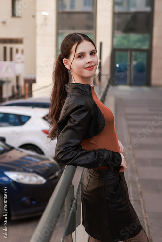 A stylish girl near a car dealership in a leather jacket and leather skirt.