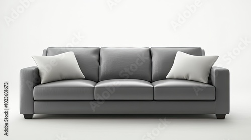A stylish gray leather sofa with two pillows in lighter tones on either end, placed on a clean white background for a contemporary design aesthetic.