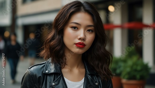 A stylish Japanese woman with red lips and effortless waves in a leather jacket.
