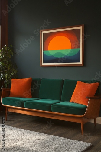 living, room, interior, design, modern, sofa, green, couch, orange, pillow, wall, art, sunset, artwork, cosy, atmosphere, home, decor, stylish, furniture, comfortable, seating, vibrant, colours, contemporary, display, rug, indoor, plant, wood, accent, colours, scheme, relaxation, space, aesthetic, natural, light, decorative, element, decoration, casual attire, family, flair, warm, tone, minimalist, style, furnishing