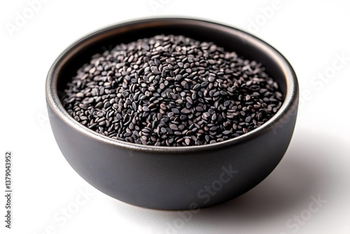 A stylish matte black ceramic bowl filled with rich black sesame seeds, premium aesthetic, ultra-detailed, isolated on solid white background.