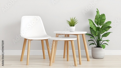 A stylish minimalist living room features a white chair and a chic set of ing coffee tables, complemented by a potted plant and a light wood floor creating a serene atmosphere.