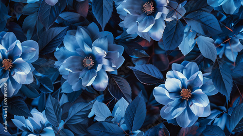 A stylish pattern of abstract blue flowers and organic tree leaves, contemporary art illustration. Ai generated