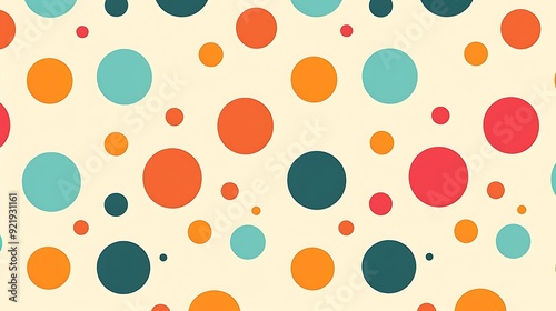 A stylish pattern with retro polka dots in bright colors like orange, teal, and magenta on a pale yellow background. High contrast, playful and retro, hd quality, cheerful and lively. --ar 16:9 --v 6.