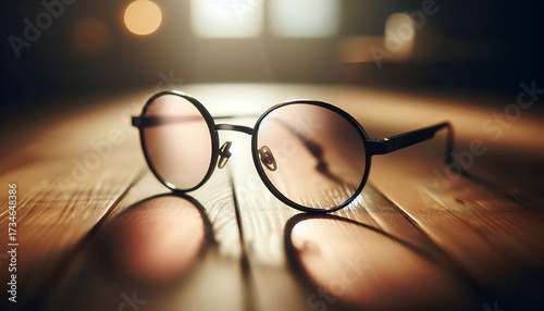 A stylish round sunglasses pair rests on a wooden table, bathed in warm indoor light