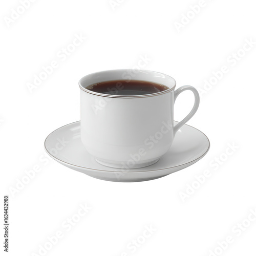 A stylish white coffee cup with a matching saucer, filled with aromatic coffee. Ideal for showcasing beverage presentation and modern dining aesthetics.