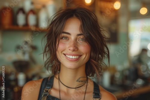 human face, person, smile, clothing, necklace, indoor, throat, brown hair, woman, lady, eyebrow, lip, portrait, long hair, girl, wall, smiling, hair, joyful, charismatic, trendy, stylish, fashionable, happiness, confident, vibrant, cheerful, elegance, beauty, youthfulness, positive, lively, eye, charme, charisma, contemporary, chic, warm colors, radiant, carefree, modern style