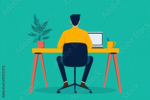 A stylish workspace featuring a person sitting at a colorful desk with a laptop, plant, and coffee cup in a vibrant setting.