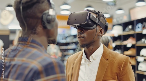 A stylish young man is interested in purchasing a virtual reality headset. In leading department stores
