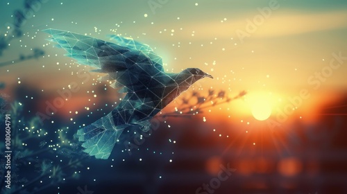 A stylized blue bird with glowing dots flies in front of a blurry sunset.
