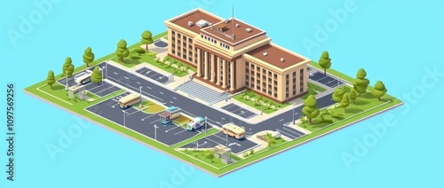 building, architecture, tree, parking, road, design, structure, urban, landscape, city, institution, facility, environment, space, layout, community, service, transport, vehicle, greenery, aesthetic, modern, construction, public, area, development, square, concrete, entrance, step, facades, symmetry, functional, organisation, planning, infrastructure, locality, amenity, accessibility, surrounding, visual, illustration, detail, perspective, scene, setting, urbanism