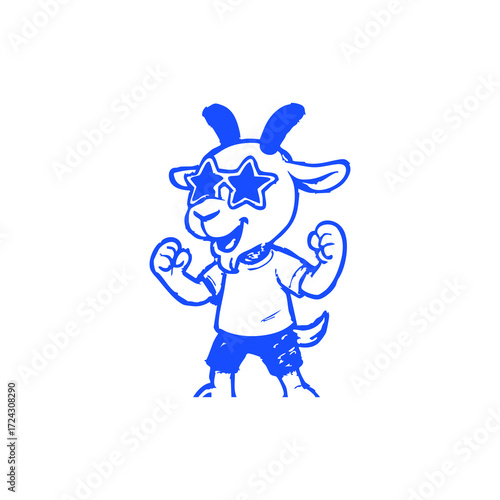goat, cartoon, animal, illustration, graphic, design, cute, happy, excited, energetic, stylish, sunglasses, star, t-shirt, short, blue, outline, drawing, vignetting, character, smiling, positive, art, friendly, fun, playful, vector, digital, line, simple, modern, style, logotype, icon, image