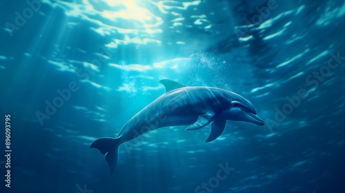 A stylized dolphin swims gracefully underwater, illuminated by ethereal light, creating a magical ocean scene.