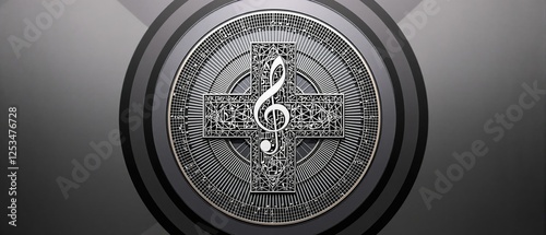 A stylized geometric cross shape formed by musical notes and treble clefs within a circular frame, circular frame, creative composition, modern aesthetic