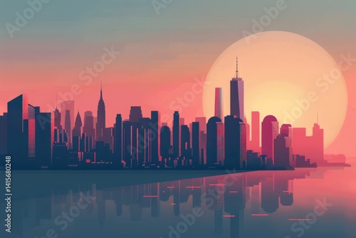 A stylized illustration depicting a city skyline with geometric shapes and a sunset backdrop, A minimalist city skyline with clean lines and geometric shapes, creating a sleek and modern aesthetic