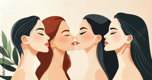 A stylized illustration of four women with different hair colors and styles, leaning towards each other, conveying themes of unity and connection.