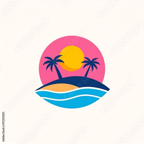 A stylized island scene with palm trees, sun, sea, and sand, within a pink circle