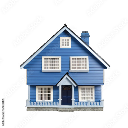 A stylized, vibrant blue house with a white trim. Front-facing, simple design. Features multiple windows and a chimney