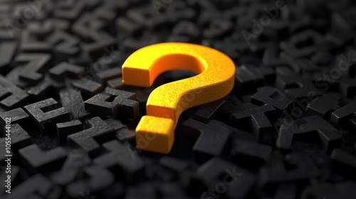 A stylized yellow question mark takes center stage against an array of black signs, including punctuation marks and directional symbols