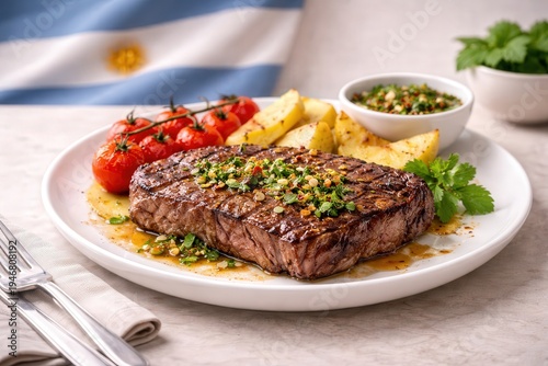 A Succulent Grilled Steak Served with Crispy Potatoes and Roasted Tomatoes, Accompanied by a Flavorful Sauce and Garnished with Fresh Herbs