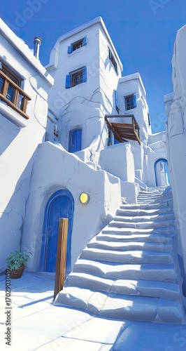 alley, stair, building, blue, white, stone, light, sunny, exterior, architecture, mediterranean, village, town, house, perspective, door, shutter, textured, decorative, design, scene, path, step, wall, view, pastel, sky, beautiful, colourful, bright, creative, modern, elegant, stylish, professional, vibrant, stunning, amazing, marvellously, fantastic, gorgeous, lovely, charming, attractive
