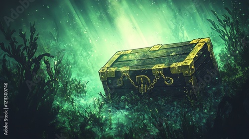 chest, treasure, sunken, ocean, underwater, seaweed, aquatic, marin, plant, algae, deep, sea, dark, green, gold, metal, wood, locked, chain, mystery, secret, pirate, ancient, lost, forgotten, discovery, exploration, adventure, submerged, hidden, water, coral, reef, shadow, light, beam, particle, bubble, fantasy, illustration, artwork, digital, art