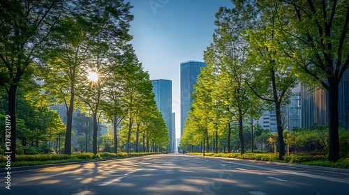 A sunlit city street lined with lush green trees leads towards modern skyscrapers on a beautiful sp morning.