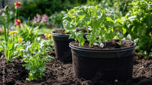 A sunny garden scene featuring potted plants with green foliage surrounded by vibrant flowers and rich soil.