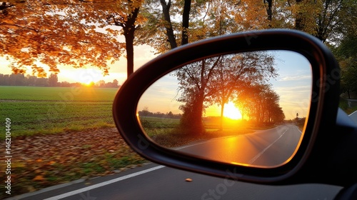 sunset, mirror, car, road, serenity, get-away, escape, exploration, perspective, vista, peaceful, highway, trip, vehicle, seasonal, relaxation, drive, sunrise, journey, dusk, horizon, transportation, sunlight, motion, retreat, tree, scenic, lane, rural, morning, orange, touring, leaf, outdoors, sky, yellow, vacation, beauty, fall, wanderlust, field, nature, adventure, travel, countryside, landscape, autumn