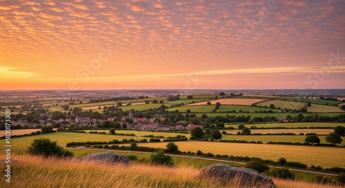 landscape, sunset, field, sky, rural, village, horizon, countryside, gold, dusk, orange, cloud, tree, light, evening, farmland, nature, beautiful, view, summer, sun, grass, hill, meadow, agricultural, scenery, peaceful, serene, atmosphere, colours, skyline, outdoors, idylli, tranquil, dawn, cultivated, terrain, elevation, distant, house, church, vegetation, natural, vibrant, bright, scene