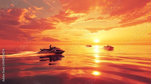 A sunset view of jet skis cruising along calm seas, with orange skies reflecting on the water surface.