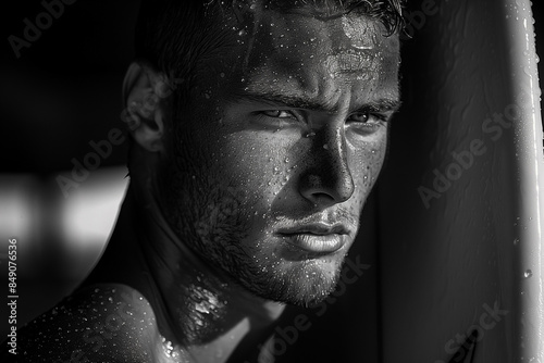 surfer, wetsuit, surfboard, water droplets, sunlight, backlit, silhouette, sun ray, golden hour, photo, extreme sport, sunset beach