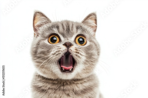 A Surprised Gray Tabby Cat with Big Eyes and Open Mouth, Captured in a Close-Up Photograph Against a White Background
