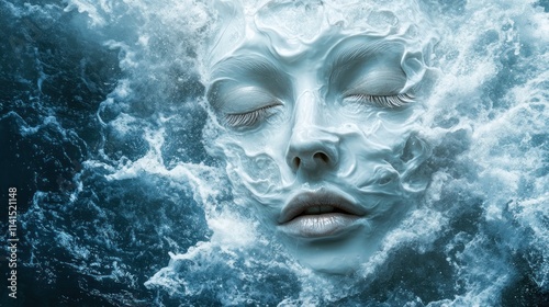 A surreal depiction of a serene face emerging from turbulent water waves.