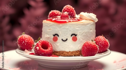 A surreal infrared image of an adorable and charming Creamy Cheesecake with Strawberries and Raspberry Sauce. Infrared tones give it an otherworldly appearance