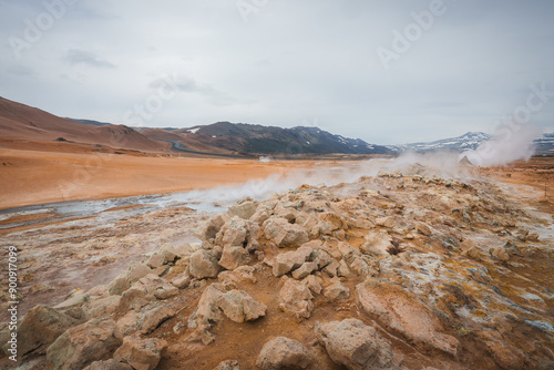 A surreal landscape at Hverir near Lake Myvatn, Iceland, featuring steam rising from fumaroles, reddish-brown and white mineral deposits, and distant snow-covered mountains.