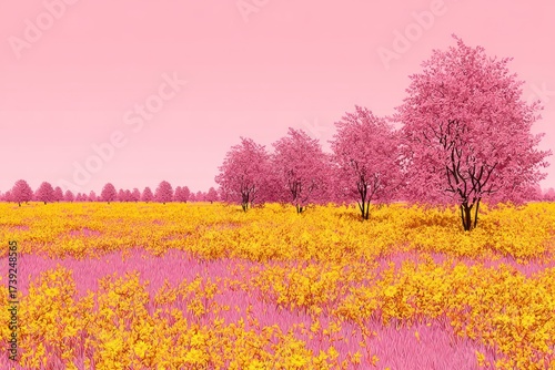 A surreal landscape with pink trees and a yellow field under a gradient pink sky